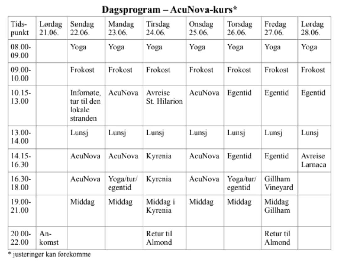 Kurset ledes av våre norske lærere, og gjennomføres i løpet av de første dagene på den vakre øya øst i Middelhavet. Ved hjelp av AcuNova vil du være i stand til å behandle en rekke ulike lidelser når du kommer hjem.